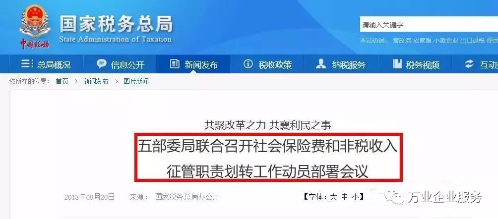 根據(jù)之前國(guó)家稅務(wù)總局、財(cái)政部、人力資源和社會(huì)保障部、國(guó)家衛(wèi)生健康委員會(huì)、國(guó)家醫(yī)療保障局視頻會(huì)議部署,今年12月10日前要完成社會(huì)保險(xiǎn)費(fèi)和第一批非稅收入征管職責(zé)劃轉(zhuǎn)交接工作,自2019年1月1日起由稅務(wù)部門統(tǒng)一征收各項(xiàng)社會(huì)保險(xiǎn)費(fèi)和先行劃轉(zhuǎn)的非稅收入。